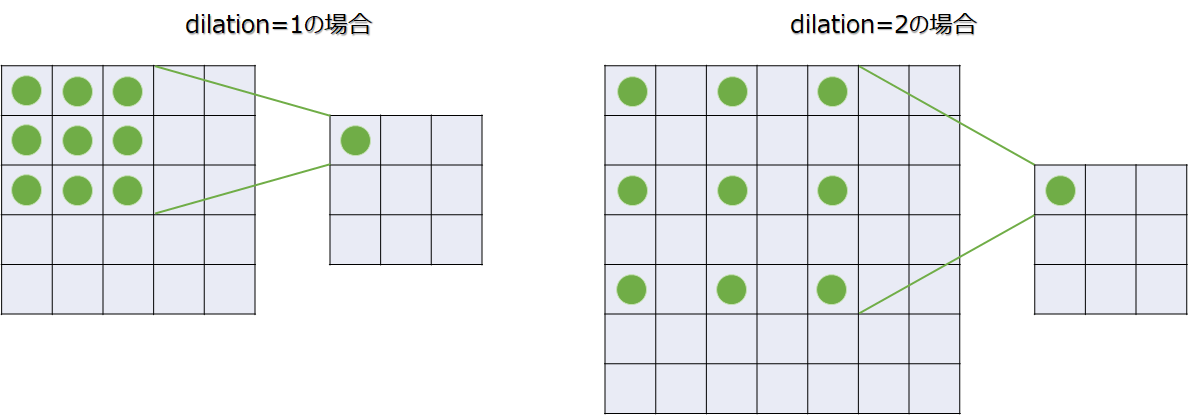 dilationとは、畳み込みフィルタのセル間隔を設定するものになります。